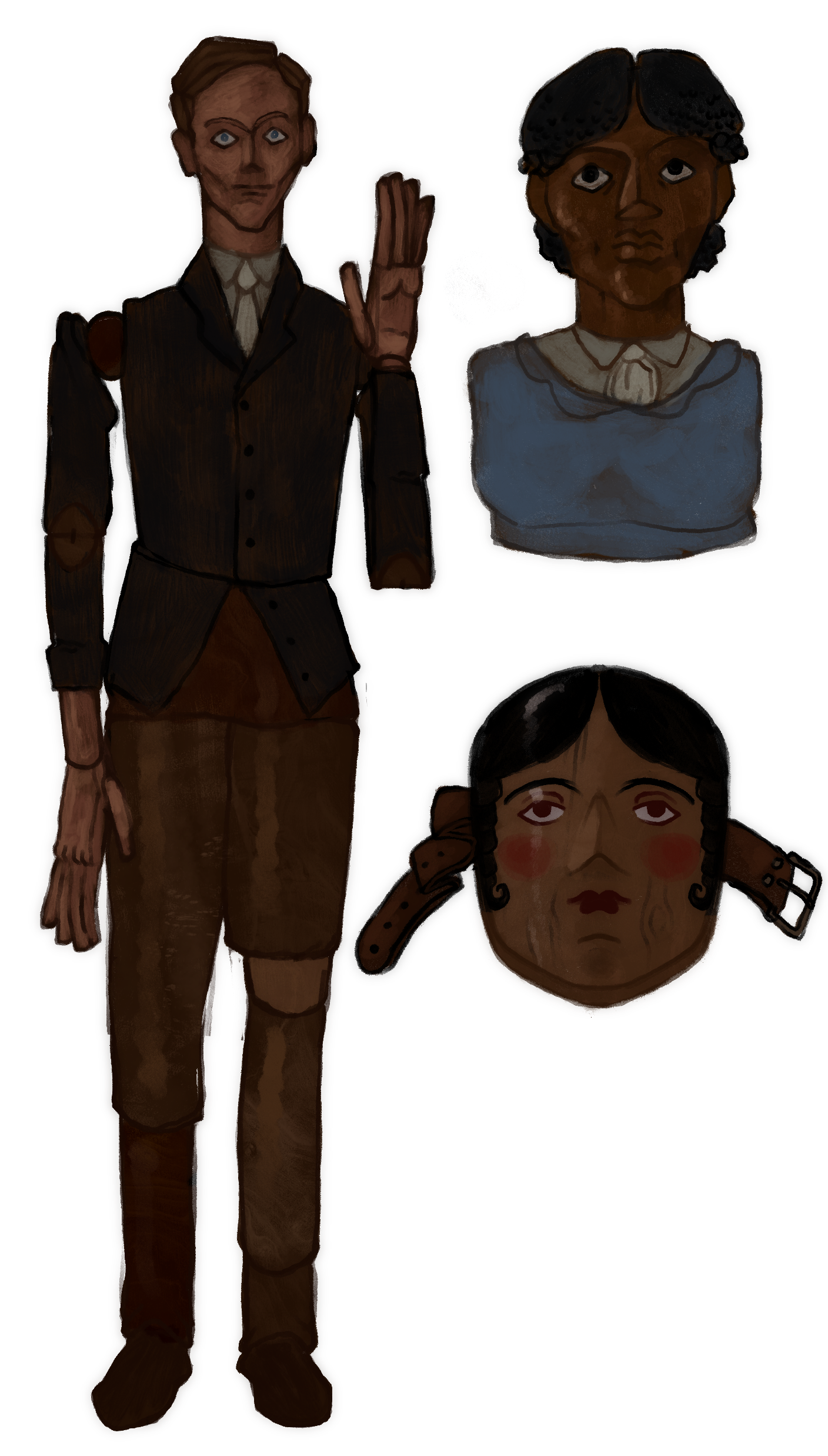 Full Figure Effigies vary wildly in stature, articulation, detail and material across different Woodworker communities and across development in time. Some featured clothes carved onto the figure while others wore the real clothes of the deceased. Articulation of the limbs was more common than one would think; Woodworkers were fond of collecting broken furniture, and thus had a lot of hinges and pegs laying around. It was most common to articulate the arms and shoulders and not the legs, so the figure could still reliably stand.